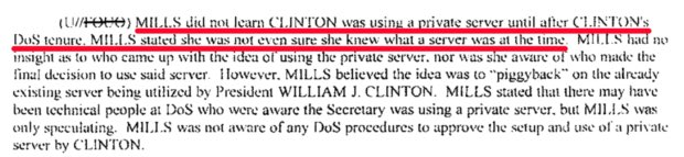 "Mills did not learn Clinton was using a private server until after Clinton's [Department of State] tenure," reads notes from Mills' April 9, 2016 interview. "Mills stated she was not even sure she knew what a server was at the time."
